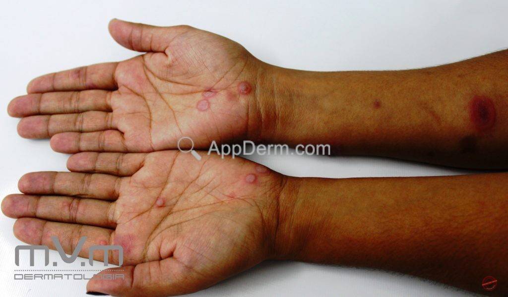 Dermatose relacionada a diversos estímulos, principalmente infecção pelo vírus herpes-simples.Infecções associadas: herpes simples (90% dos casos), parapoxvírus (Orf), vírus Epstein-Barr, Citomegalovírus, Adenovírus, HIV, Mycoplasma pneumoniae, Salmonella, Mycobacterium tuberculosis, Histoplasma capsulatum e dermatófitos.Medicamentos associados (não usual): AINE`s, sulfonamidas, alopurinol, etc.Exposições associadas (não usual): Hera venenosaDoenças associadas (raras): doença inflamatória intestinal, LES (síndrome de Rowell).AppDerm®