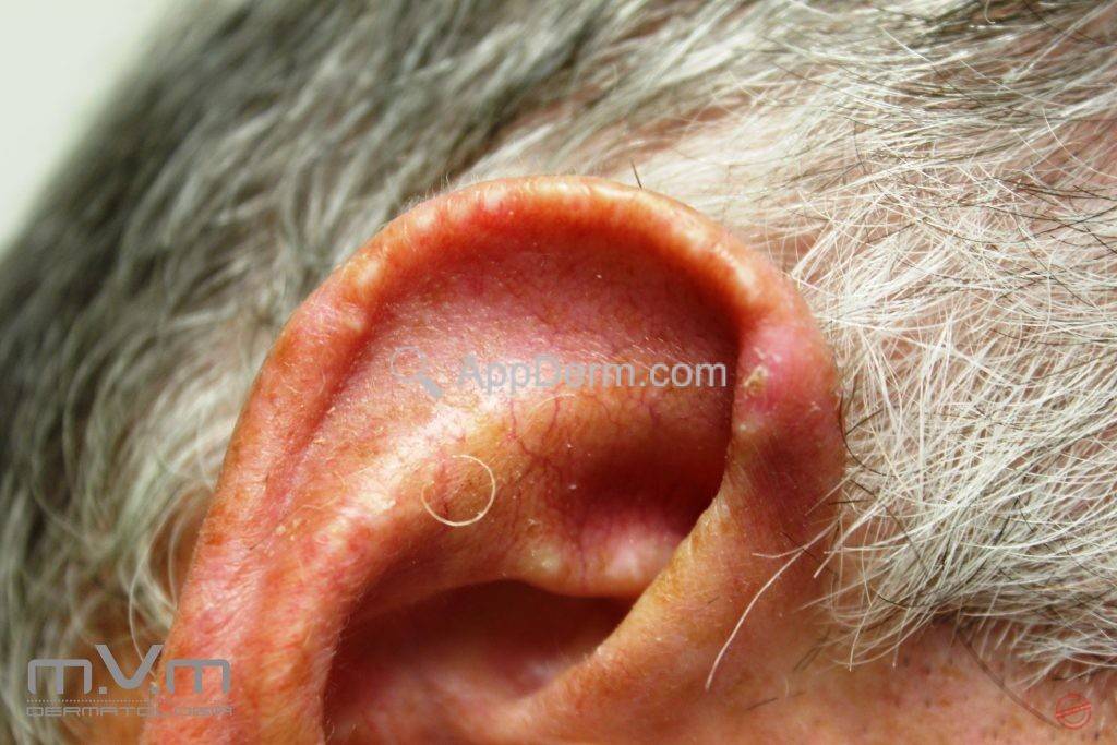 Nódulos erodidos da orelhaDesconhecida.Fatores associados: exposição crônica aos raios UV e presença de lesões actínicas.AppDerm®
