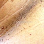 Histopatológico: hiperqueratose, discreta acantose, papilomatose e aumento de pigmentação na camada basal.