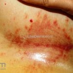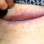 Na pele surgem placas eritematosas maceradas e esbranquiçadas, que podem apresentar pústulas e pápulas satélites.