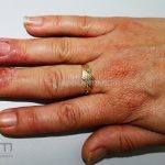 São placas eritematosas, maceradas, com pápulas eritematosas satélites. Paroníquia e onicomicose: caracterizados pela inflamação dos tecidos periungueais, distrofia da lâmina ungueal, e hipertrofia da dobras ungueais laterais e proximal.