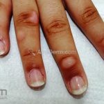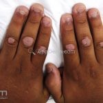São pápulas ou placas normocrômicas e hiperqueratósicas na face dorsal dos dedos.