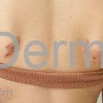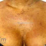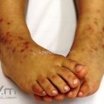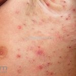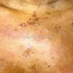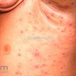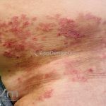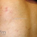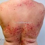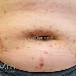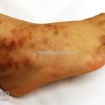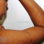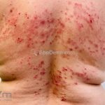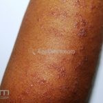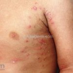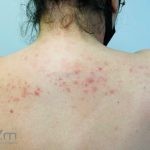 Encontramos pápulas eritematosas, urticadas e vesículas, agrupadas, com distribuição simétrica sobre a face extensora dos membros, tronco, dorso, axilas, ombros e mucosa oral. As lesões são intensamente pruriginosas.