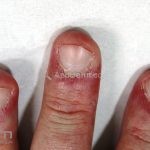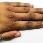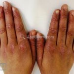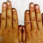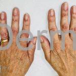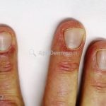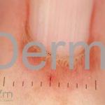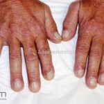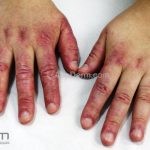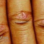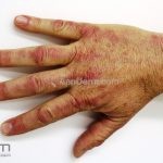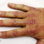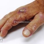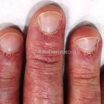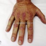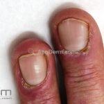 Na pele, podemos encontrar eritema e edema ao redor dos olhos (heliotropo); pápulas achatadas liquenoides no dorso das articulações interfalangeanas, cotovelos, joelhos e tornozelos (pápulas de Gottron); eritema violáceo sobre as articulações interfalangeanas, cotovelos e joelhos (sinal de Gottron); eritema periungueal (sinal de Keinig); telangiectasias periungueais (marcador atividade de doença); distrofias cuticulares nas mãos; áreas de poiquilodermia podem ocorrer na nuca, região dorsal superior e V do decote (sinal do xale); eritema, descamação e prurido em couro cabeludo; eritema flagelado; erosões; e ulcerações podem estar presentes.