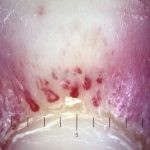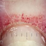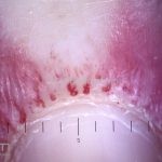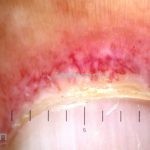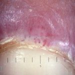 Histopatológico: na pele, encontramos atrofia da epiderme, hiperqueratose, perda das cristas epidérmicas, dermatite de interface vacuolar, apoptose de queratinócitos (corpos citoides), incontinência pigmentar, infiltrado linfocitário perivascular superficial, edema dérmico e depósitos de mucina.