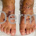 As lesões vesiculobolhosas frequentemente aparecem em um arranjo herpetiforme na pele eritematosa e/ou de aparência normal. Alguns pacientes apresentam placas anulares em expansão, enquanto outros apresentam lesões dispersas e assimétricas.