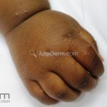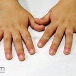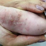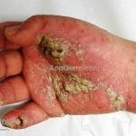 Em recém-nascidos e lactentes ocorrem lesões vésico-pustulosas acrais.