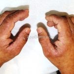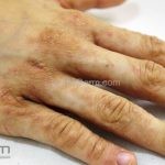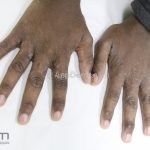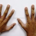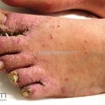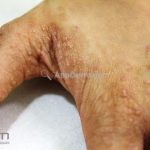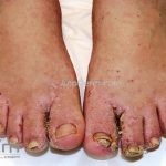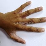 A sarna crostosa geralmente se manifesta com hiperqueratose acentuada em locais acrais, incluindo regiões subungueais, mas o envolvimento pode ser generalizado.