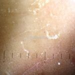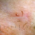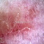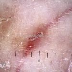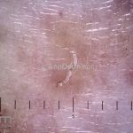 Dermatoscopia: a porção anterior do ácaro corresponde a uma estrutura triangular amarronzada, localizada na porção final de um túnel. No trajeto do túnel, em alguns casos, é possível a visualização de pontos pretos que correspondem as síbalas do ácaro.