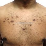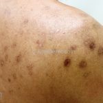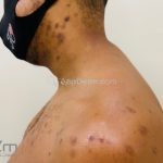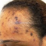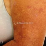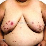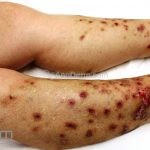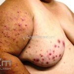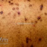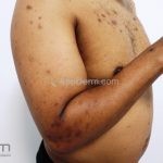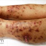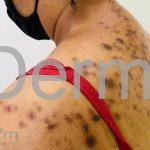 Na pele, encontramos lesões em diferentes estágios de evolução e em diferentes formatos. Os pacientes podem apresentar erosões superficiais, ulcerações profundas com bordas hipertróficas, cicatrizes e manchas. Geralmente, as lesões são distribuídas sobre os antebraços, couro cabeludo, face, tronco superior e nádegas.