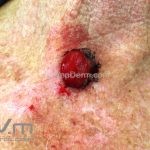 A lesão se apresenta como um nódulo cupuliforme de crescimento rápido, 1 a 2 cm de diâmetro, com crostas serossanguíneas na superfície e pode apresentar ulcerações e sangramentos.