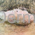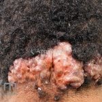 Com a progressão da doença, outras pápulas endurecidas se desenvolvem e coalescem, podendo formar grandes placas queloidianas.