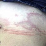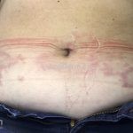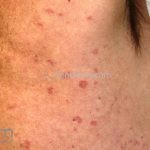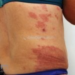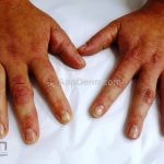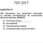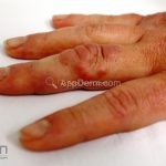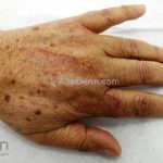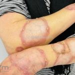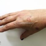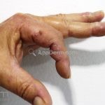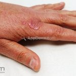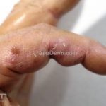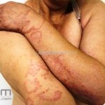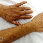 Forma perfurante: múltiplas pápulas eritematosas e descamativas com umbilicação central. Ocorrem no dorso das mãos e dedos. Ao histopatológico, há eliminação transepidérmica de colágeno degenerado. Essa forma pode ocorrer sobre cicatrizes de herpes-zóster.