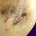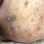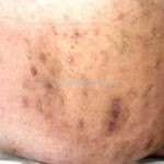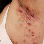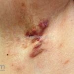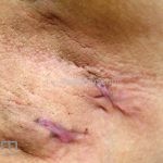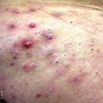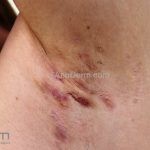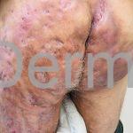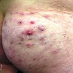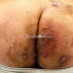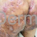 As lesões são pápulas e nódulos inflamatórios, que evoluem rapidamente, formando coleções purulentas e fístulas que drenam na superfície da pele. A dor é intensa. Ao cicatrizar ocorre formação de bridas e cicatrizes hipertróficas.