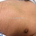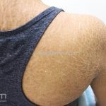 As lesões iniciam no primeiro ano de vida, ocorrem xerose cutânea e descamação leve a moderada. As escamas são brancas e finas, melhor visualizadas nas superfícies extensoras dos membros. Em casos mais graves, a descamação pode ocorrer no tronco, couro cabeludo, testa e bochechas. Áreas úmidas, como as flexurais e seborreicas, são poupadas.