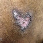 Na pele, encontramos uma área de eritema, levemente elevado, bem demarcado e com presença de erosões, em alguns casos, ocorrem telangiectasias e lesões vesicobolhosas.