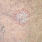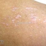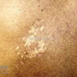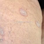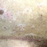 Com a evolução, as pápulas coalescem e formam placas maiores, costumam adquirir um aspecto tipo cicatriz, levemente escleróticas de coloração branco-marfim, que revelam pequenos orifícios com rolhas na superfície.