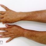 Fotoproteção: utilização de filtro solar com amplo espectro para UVA e UVB, mínimo fator 30, associado a protetores físicos com dióxido de titânio e óxido de zinco, reaplicado várias vezes ao dia.