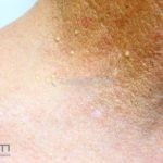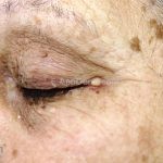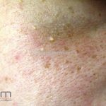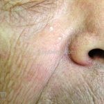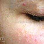 São pequenos cistos de 1 a 2mm de diâmetro, brancos, geralmente múltiplos, assintomáticos, localizados em face.