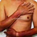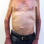 Na pele, encontramos um eritema em áreas foto-expostas com ardência local. Caracteristicamente, áreas protegidas pelo sol são poupadas. Pode haver um rash nos malares e quando ocorre em região cervical, chamamos de ”colar de casal”.