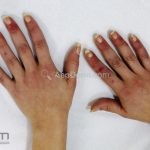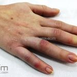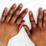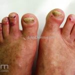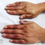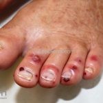 A distribuição das lesões ocorre de forma simétrica, sobre as extremidades (mãos, pés, cotovelos, joelhos, orelhas e nariz).
