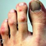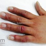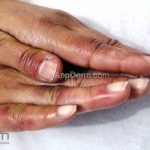 As lesões são máculas, pápulas ou nódulos, únicos ou múltiplos, eritematosos, cianóticos ou violáceos. Bolhas e ulcerações podem ocorrer nos casos graves.