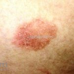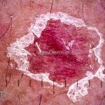 Dermatoscopia: descamação periférica ao redor de um centro amarelado, com ausência de estruturas, e vasos pontilhados.