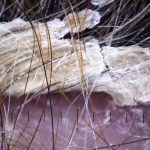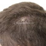 Essas escamas podem variar de tamanho podendo acometer grandes áreas do couro cabeludo, quando as escamas são puxadas, elas desprendem do couro cabeludo juntamente com os chumaços de cabelos aderidos.