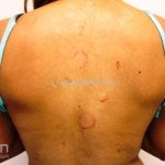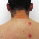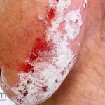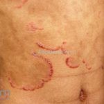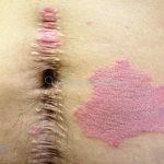 As lesões psoriáticas são, algumas vezes, rodeadas por um halo claro, denominado anel de Woronoff. Quando retiramos a escama da lesão, com curetagem, observamos o “sinal da vela raspada” e o “sinal de Auspitz” (aspecto hemorrágico sobre a lesão).