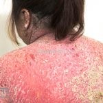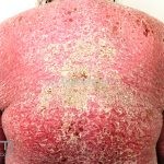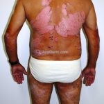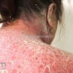 Psoríase eritrodérmica: eritrodermia esfoliativa de instalação aguda ou crônica (o rosto costuma ser poupado). As unhas costumam manifestar sinais da doença.
