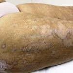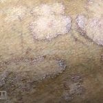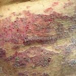 Histopatológico: ocorrem paraqueratose confluente, hipogranulose e hiperplasia psoriasiforme (acantose epidérmica marcada por cristas interpapilares uniformemente alongadas).