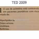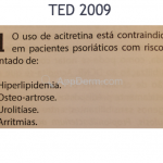 Acitretina: indicado como monoterapia para as formas eritrodérmica e pustular, ou para psoríase grave não controlada com fototerapia. Utilizada nas doses de 0,5mg/kg/dia (em placas); ou 0,25mg/kg/dia (eritrodérmica), ou 1mg/kg/dia (pustular). Efeitos colaterais: teratogenicidade (3 anos), queilite, xerose cutânea, calcificações, alterações do colesterol e triglicerídeos. Contra-indicações: doença hepática, doença renal, gravidez, lactação, dislipidemia, fármacos hepatotóxicos concomitantes (metotrexato), diabete descontrolado, consumo de álcool, ateroesclerose, histórico de pancreatite, paciente não confiável.