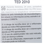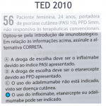 Etanercept: é uma proteína de fusão humana, dirigida contra os receptores TNF-a (solúvel). Indicado para a psoríase moderada a severa, mediante intolerância, contraindicação, ou falha a duas terapias sistêmicas convencional, artrite reumatoide, artrite idiopática juvenil, espondilite anquilosante, artrite psoriática e psoríase. É administrado via subcutânea, na dose de 50mg, 2x/semana, por 12 semanas, seguida por uma diminuição progressiva (50mg/semana), de forma contínua. Para crianças a dose é de 0,8mg/kg/semana (máximo 50mg/semana). Efeitos adversos: reação no local de administração da droga, infecções, trombocitopenia, anemia, leucopenia, convulsões, eventos desmielinizantes, incluindo esclerose múltipla.