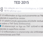 Infliximab: é um anticorpo monoclonal murino quimérico isotipo IgG1 humanizado, dirigido contra receptores de TNF-a solúveis e transmembranosos. Indicado para psoríase moderada a grave, doença de Crohn, artrite reumatoide e espondilite anquilosante. É administrado por infusão venosa durante um período de duas horas, na dose de 5mg/kg, nas semanas 0, 2 e 6, seguido de infusões repetidas únicas de manutenção em intervalos de 8-12 semanas. Efeitos adversos: reações à infusão, anafilaxia, neoplasias, reativação de tuberculose.