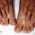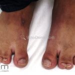 Outros achados cutâneos incluem seborréia acentuada, anomalia das unhas (do 2º ao 4º dedo) e pigmentação difusa dos cabelos e da pele.