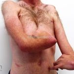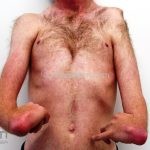 As manifestações cutâneas ocorrem nos primeiros anos de vida, apresentando eritema, telangiectasias, bolhas, vesículas, atrofia e cicatrizes.