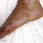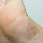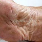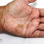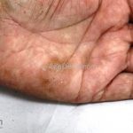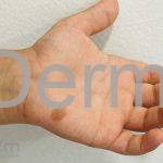 Ocorre uma mancha acastanhada de pequenas dimensões em região palmar e, eventualmente, em região plantar, pescoço e tórax.