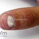 Alteração da coloração da unha, adquirindo cor branca. Aparente: quando a modificação da cor está no leito ungueal. Verdadeira: quando a modificação da cor está na lâmina ungueal, pode ser total, parcial, estriada ou em pontos. Pseudoleuconíquia: quando há algum elemento de coloração branca aderido à lâmina ungueal.