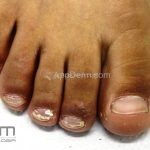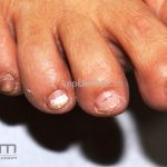 DISTAL SUBUNGUEAL: é quando a infecção se inicia no hiponíquio, parasitando a queratina do leito ungueal. É a apresentação mais frequente. Provocada por fungos dermatófitos, não dermatófitos e leveduras
