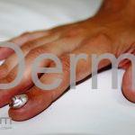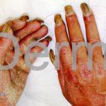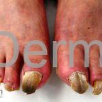 A hiperqueratose subungueal em forma de cunha leva à elevação, espessamento e escurecimento da placa ungueal, que pode assumir uma forma de “ômega” com envolvimento mais proeminente distalmente do que proximalmente. Pode ou não haver envolvimento de todos os dedos, mas os dedos dos pés, polegares e indicadores tendem a ter unhas mais severamente afetadas. Em lactentes, o eritema do leito ungueal pode preceder o aparecimento de alterações distróficas.