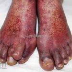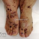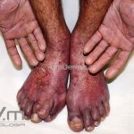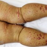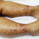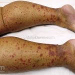 Ocorrem pápulas e placas pupúricas em áreas pendentes do corpo, principalmente nos membros inferiores.