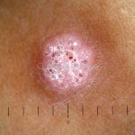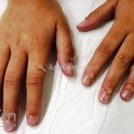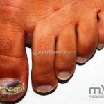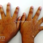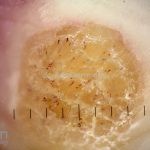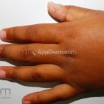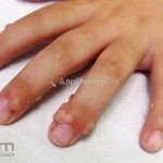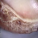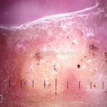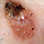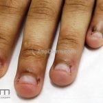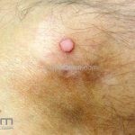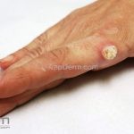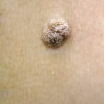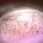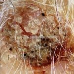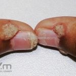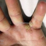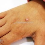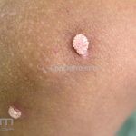 Verruga vulgar: são pápulas queratósicas, normocrômicas, de superfície irregular e com presença de vasos cutâneos trombosados (melhor visualizado à dermatoscopia). Localizam-se preferencialmente em mãos, dedos e região subungueal.