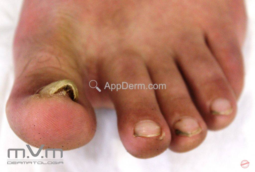São unhas espessadas e curvas, que devido o crescimento assumem um aspecto grosseiro. Os hálux são os mais acometidos.AppDerm®